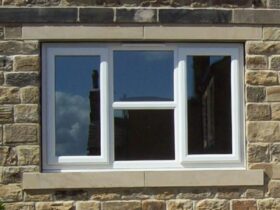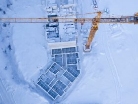 Another room adjacent to the living room is the library. The wide opening has blue glass folding doors. One of the walls here is covered with plasterboard and painted soft purple.