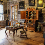 The furnishings on the second floor include baroque elements that fit perfectly into the eclectic design. In particular, the contrasting combination of a luxurious baroque armchair and wall painting with a fantasy-style plot attracts attention in the office. The complex space is complemented by an irregularly shaped skylight.